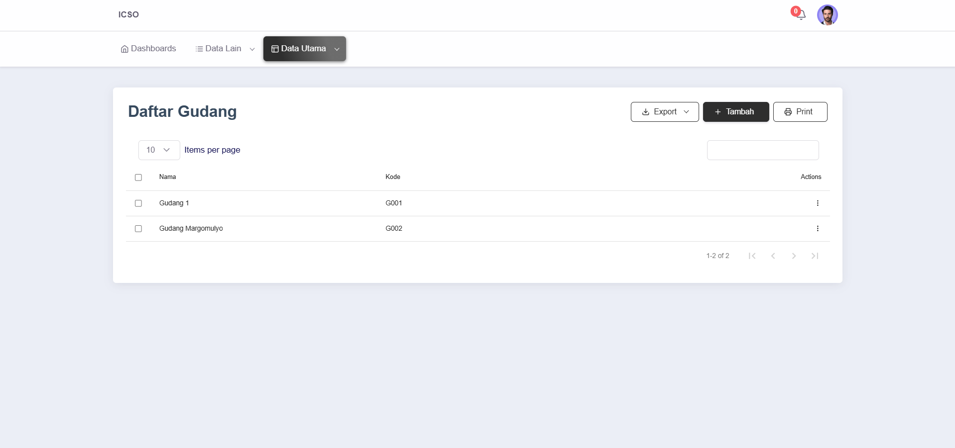 - Export: Mengunduh daftar gudang ke dalam file (Excel/PDF).