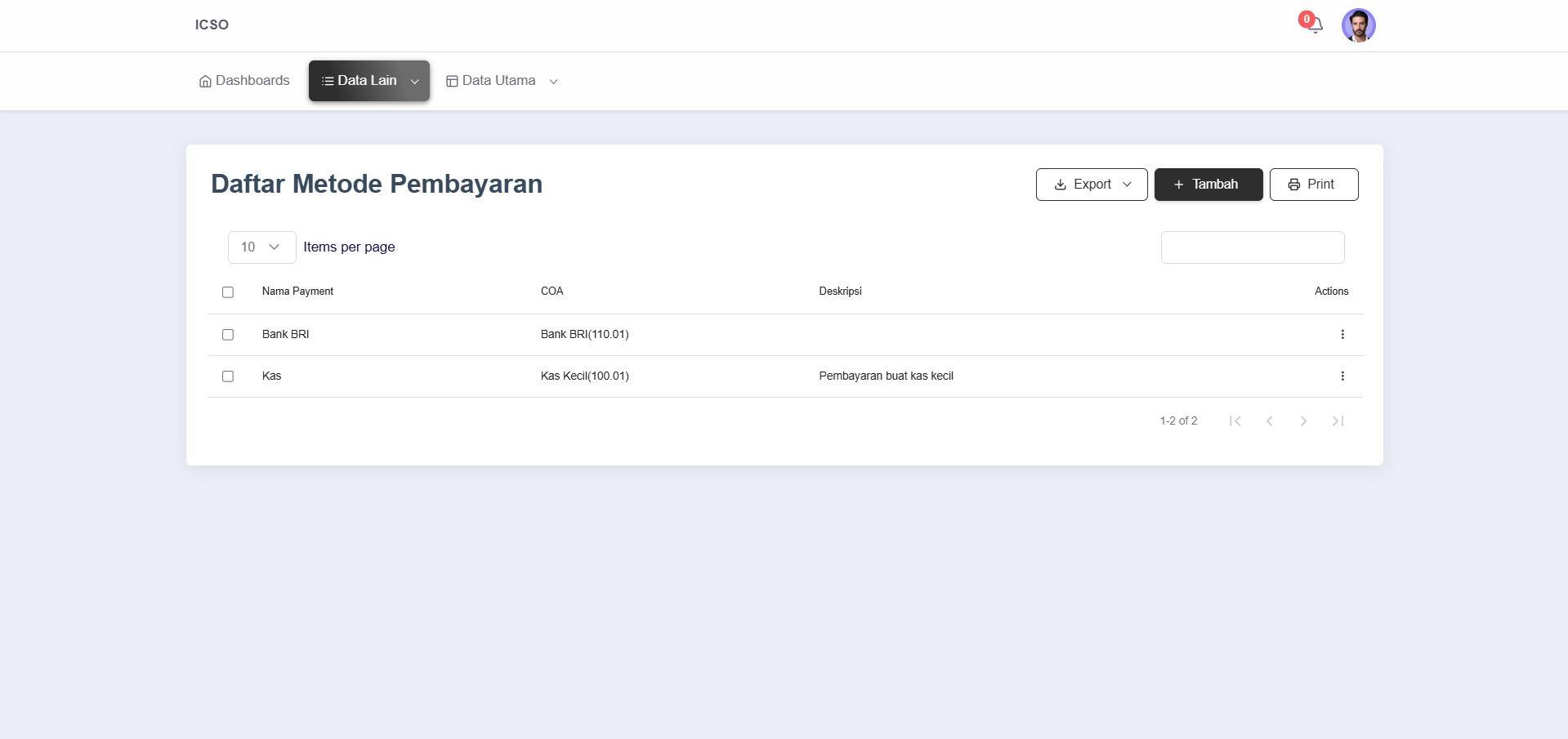 - Export: Mengunduh daftar metode pembayaran (Excel/PDF).