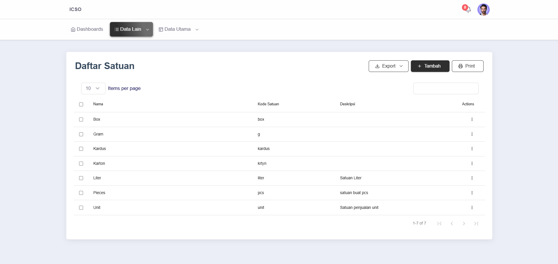 - Export: Mengunduh daftar satuan ke dalam format laporan (Excel/PDF).